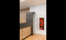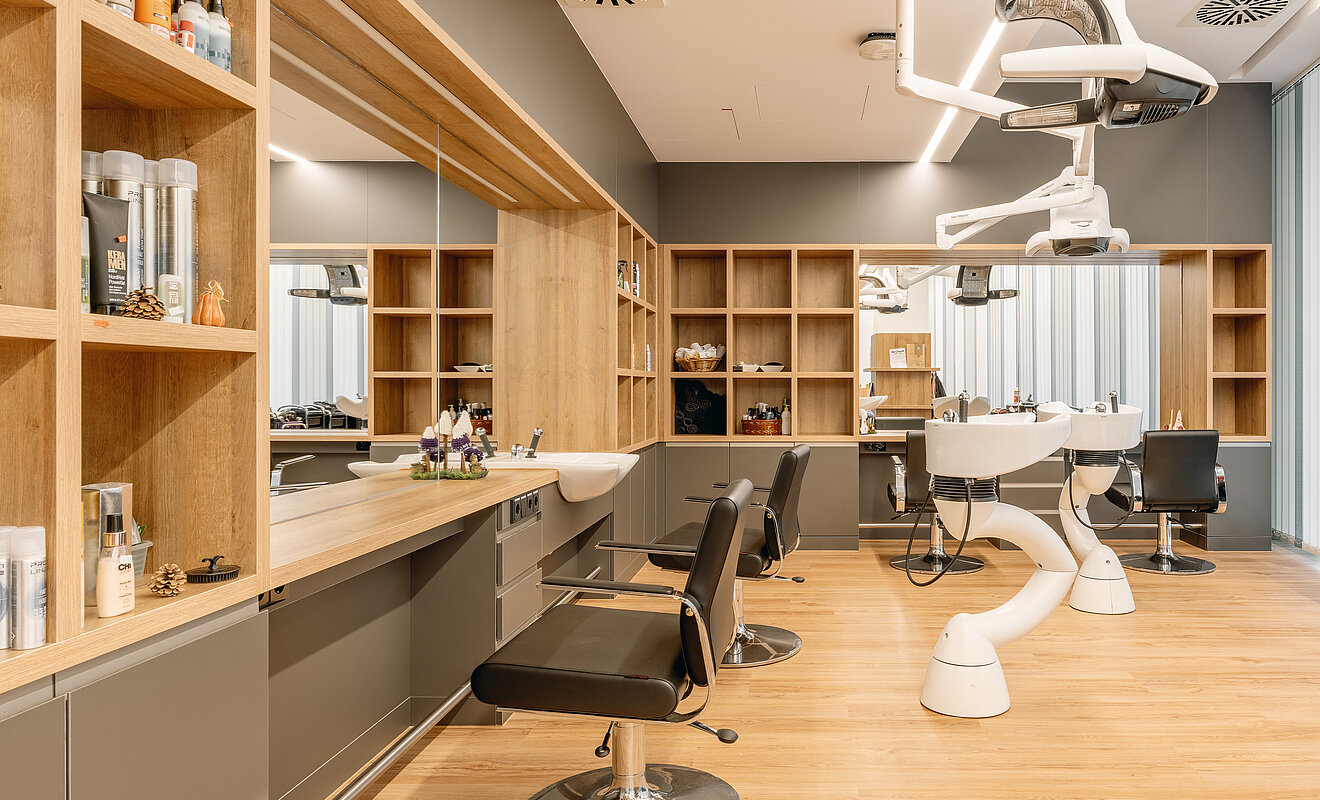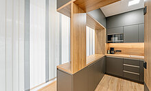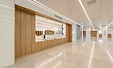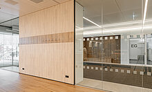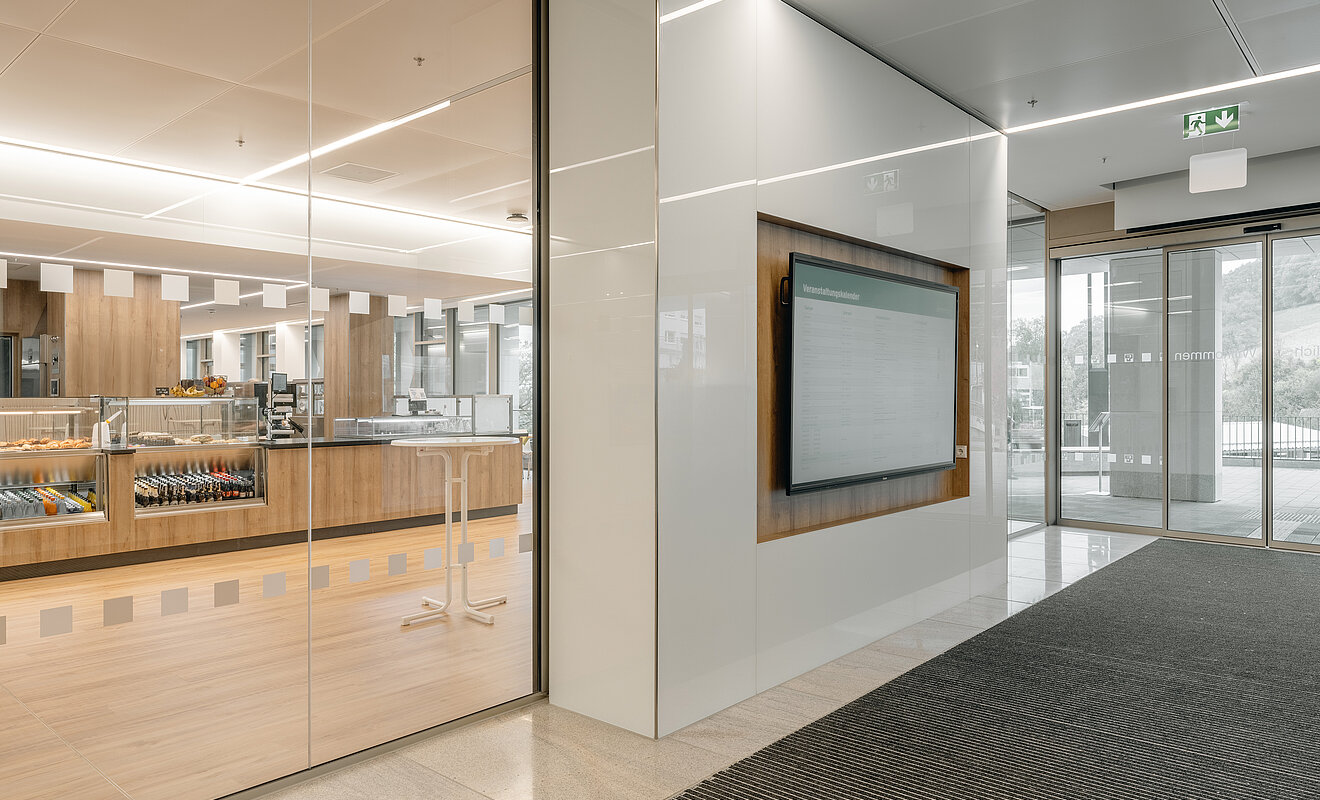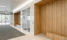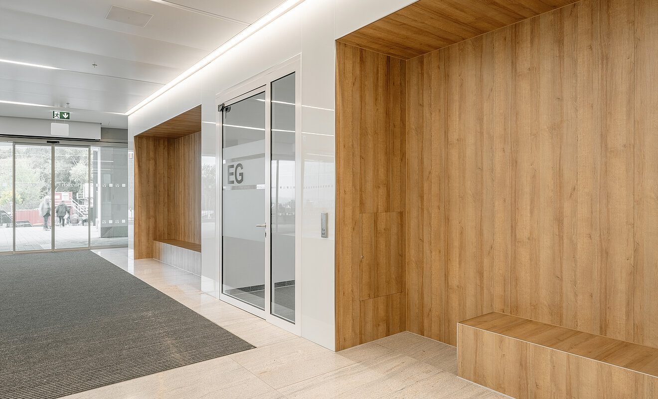 Die Ausbau-Spezialist:innen kümmerten sich auch um die Montage zahlreicher Wandverkleidungen – von 210 m2 ESG-Glas- über 900 m2 HPL- bis hin zu akustisch wirksamen Verkleidungen an der integrierten Garderobe in der Cafeteria. Die besondere Herausforderung lag dabei in den zahlreichen Sondereinbauten wie beispielsweise Briefkästen, Nischen für integrierte Flachbildschirme und Revisionstüren.