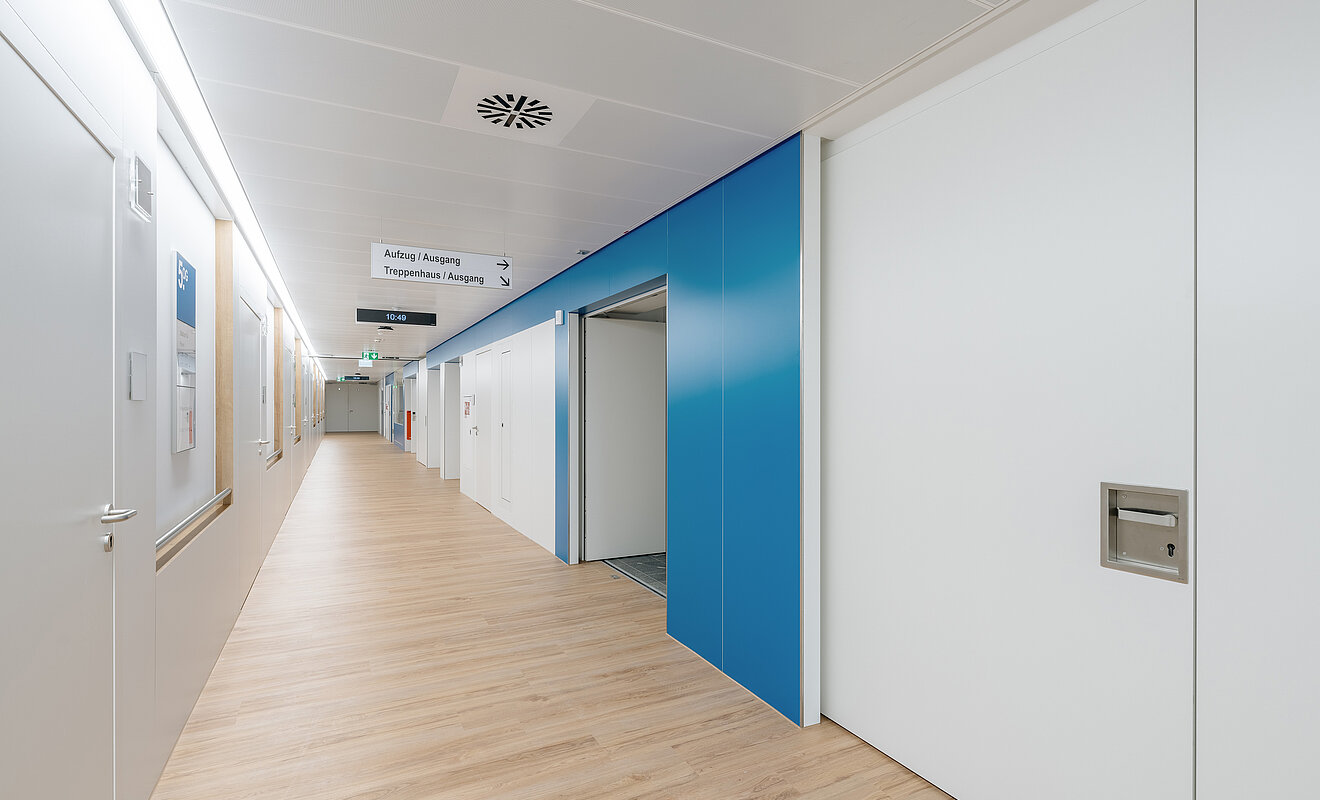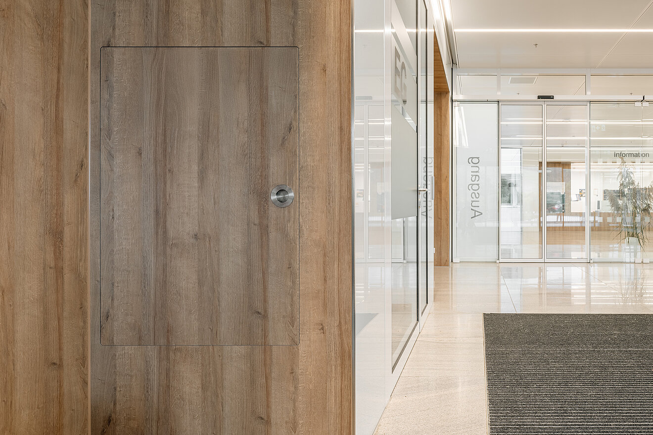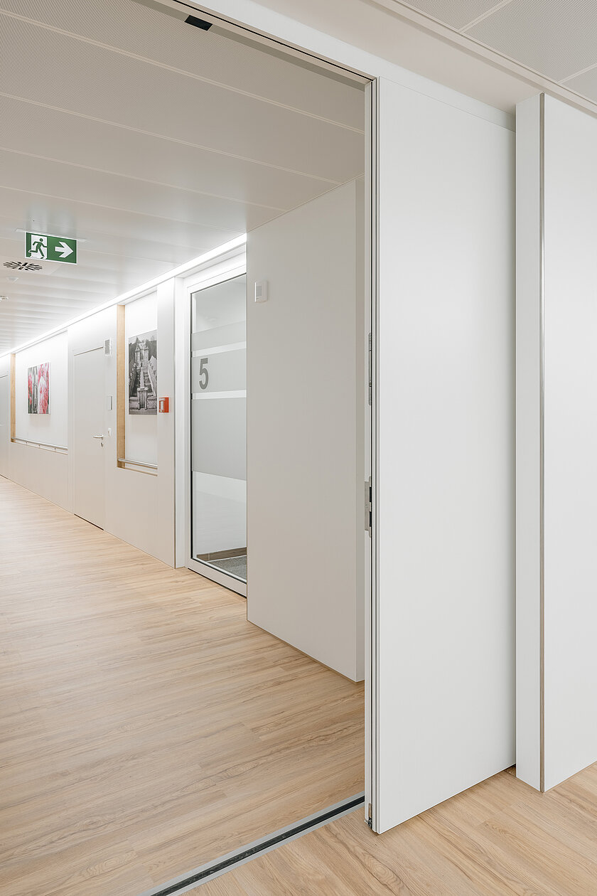 Auch im Bereich der Türsysteme zeigte das Team von TM Ausbau sein technisches Know-how und stattete die Klinik mit mehr als 300 Türen aus. Neben den Flurtüren zählten auch Nischentüren, die gleichzeitig Brandschutztüren sind, sowie eigens entwickelte Spitalzargentüren für die Patient:innenzimmer zum umfangreichen Leistungspaket. Dabei war der Einbau der Türen inklusive eingelassener Griffmuscheln flächenbündig mit der Wandverkleidung technisch besonders komplex.