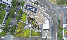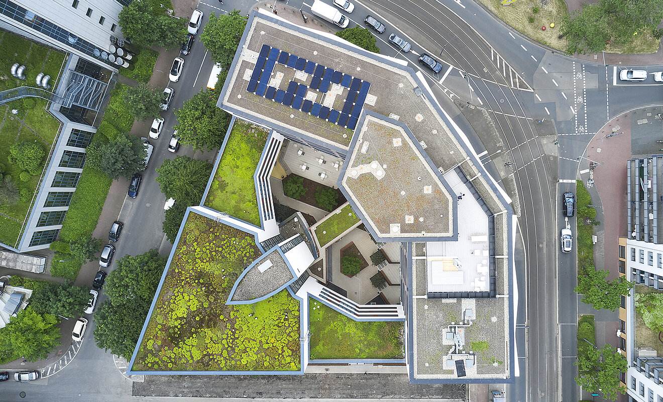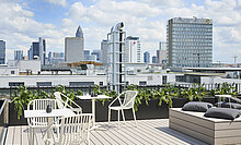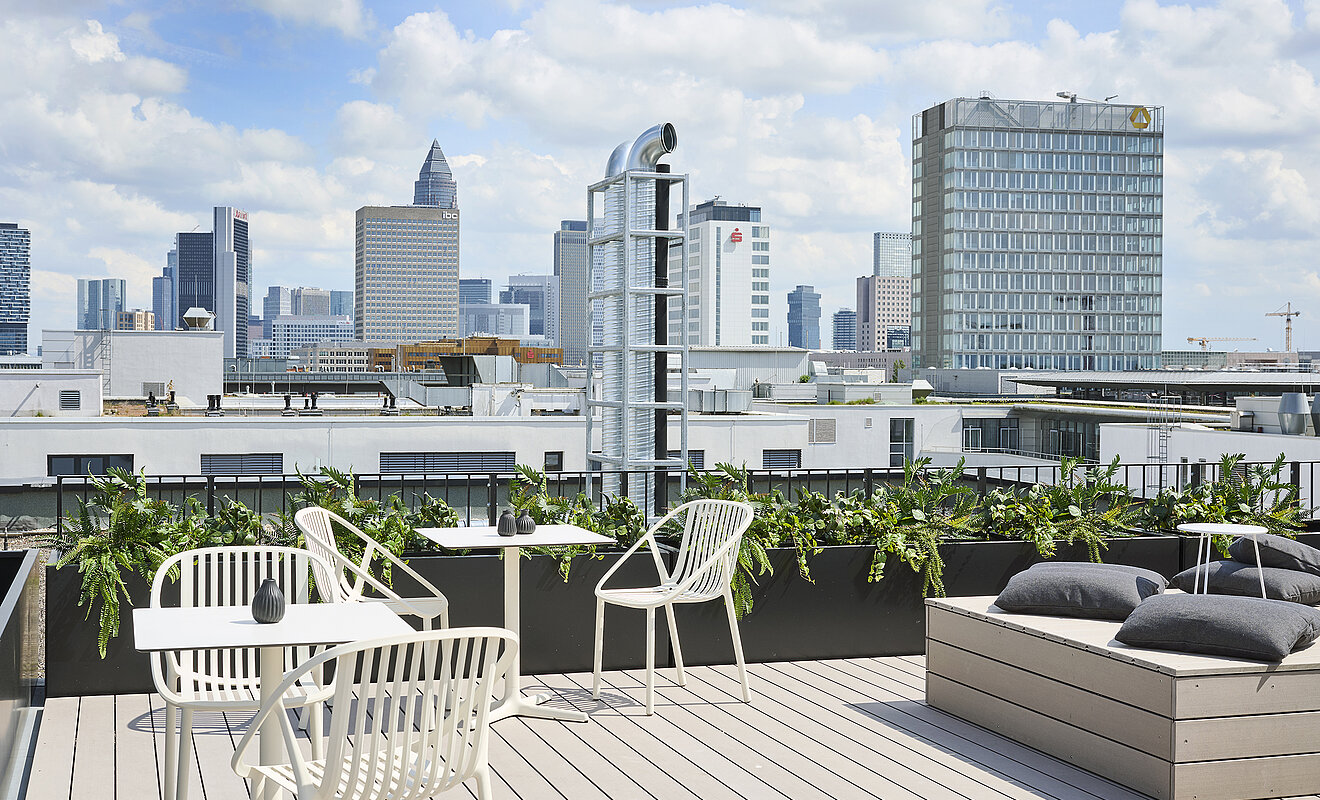 Zusätzlich lag die Realisierung der Außenanlagen sowie die Dachterrasse inklusive Begrünung und Photovoltaik-Anlage in den Händen von TM Ausbau. Mit Blick auf die atemberaubende Skyline der Stadt ist die grüne Oase des HAVENS LIVING Frankfurt der ideale Treffpunkt, um zu entspannen und zu connecten. Bei der Gestaltung der Dachterrasse kamen speziell angefertigte Konstruktionen aus Aluminium mit darauf befestigten WPC-Bohlen zum Einsatz.