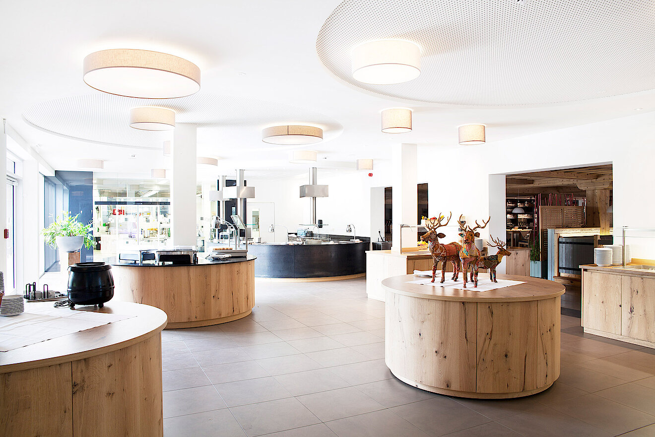Auch der 800 m² große Spa-Bereich, in dessen Mittelpunkt ein grandioses Schwimmbad mit Blick auf die umliegende Natur steht, lädt zum Relaxen ein. Die akustisch wirksame Decke wurde mit speziellen, feuchteresistenten GK-Lochplatten ausgeführt. Eingefasst wird das Deckenfeld mit einer tiefer abgeordneten Lichtvoute, die für ein angenehmes indirektes Licht sorgt. Auch hier schafft der Farbton Blau den Bezug zur Natur, was durch die große Fensterfront noch verstärkt wird. Das Alpenpanorama verschmilzt mit Wasser und Decke und der Raum scheint ohne Begrenzung zu sein.