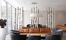 Zur entspannenden Atmosphäre tragen maßgeblich die abgehängten Decken in den öffentlichen Bereichen bei, die als große mit Lochplatten beplankte Rotunden ausgebildet wurden. Diese Inseln sorgen für die notwendige Absorption und eine gute Raumakustik am Empfang und im Restaurant. Das Blau der Wände und das abgetönte Gelb der wiederum in unterschiedlicher Höhe und Durchmesser abgesetzten zylinderförmigen Leuchten sorgen bei den Gästen für Ruhe und Entspannung. Realisiert hat diesen gelungenen Innenausbau das Team von TBM Innenausbau.