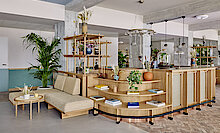 Zusätzlich konnte TM Ausbau bei diesem Konzept des temporären Wohnens seine volle Kompetenz in Sachen Holz unter Beweis stellen. Dabei kümmerten sich die Interior-Expert:innen um die Ausstattung der geräumigen und designorientierten Apartments inklusive der Garderoben- und Schreibtischmöbel in naturmatt lackierter Eiche sowie 9.000 m² verlegtes Holzparkett und die hellblauen Einbauküchen mit grifflosen Fronten. Ein besonderer Eyecatcher sind die Studios mit freihängender Stahlkonstruktion, die mit einer Stahl-Holz-Treppe eine zweite Ebene bilden. Maßgefertigte Polstermöbel mit Kvadrat-Bezugsstoff komplettieren die minimalistische Einrichtung.