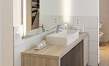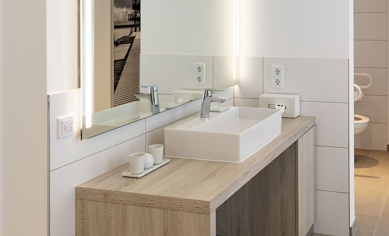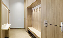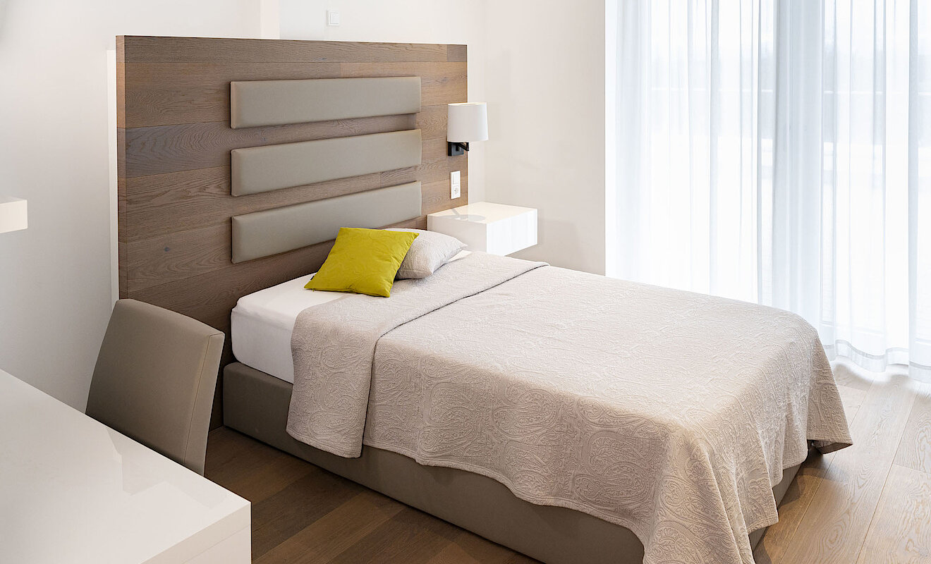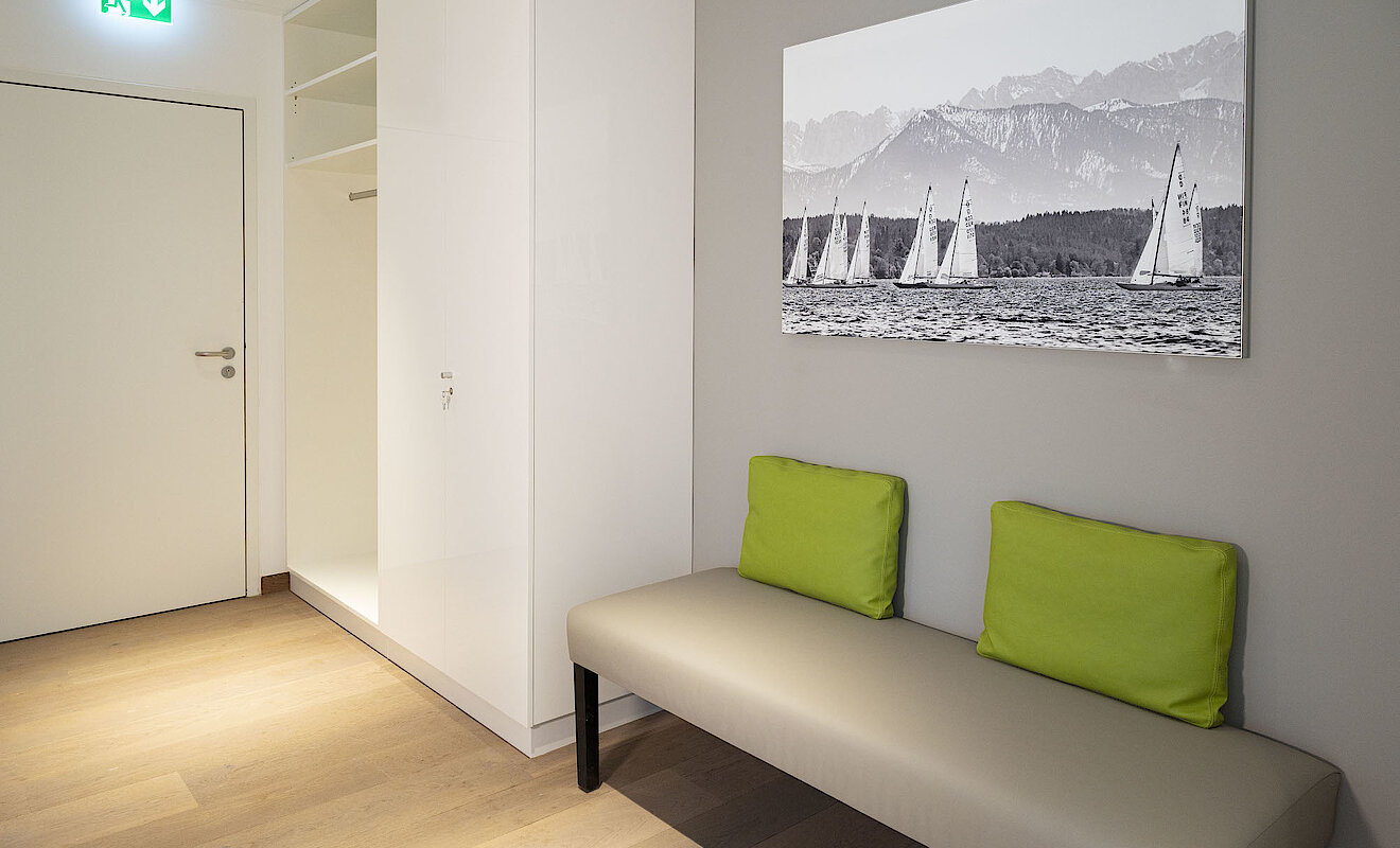 Die Versorgung der Patient:innen auf höchstem Niveau wird im Benedictus Krankenhaus Feldafing durch die innovative Bauweise des kreuzförmigen Neubaus bestens unterstützt. Über 60 Ärzte, 80 Therapeut:innen und 150 Pflegekräfte in den vier Fachbereichen neurologische Rehabilitation, geriatrische Rehabilitation, orthopädische Rehabilitation sowie Schmerzmedizin bereiten Patient:innen auf den Alltag nach einem stationären Aufenthalt vor. Für den Möbelbau hat TM Ausbau anspruchsvolle Schreinerarbeiten in den Patienten- und Privatzimmern ausgeführt, wie zum Beispiel die Schränke, TV-Möbel und Badezimmerausstattung. Hinzu kommen in den öffentlichen Bereichen des Krankenhauses maßgefertigte Möbel, Schränke und Sideboards für die Empfangstheken, Küchen, Restaurant sowie diei Kantine für die Mitarbeitenden. Auch die Umkleideschränke und verschiedene Verkleidungen waren im Leistungspaket inbegriffen. Einen traumhaften Blick von der modernen Reha-Klinik auf den Starnberger See und die Berge geben die 2.500 m² großen Holzterrassen und umlaufenden Balkone frei, deren Umsetzung als wichtiger Bestandteil des Komplettbaus in den Händen von TM Ausbau lag.