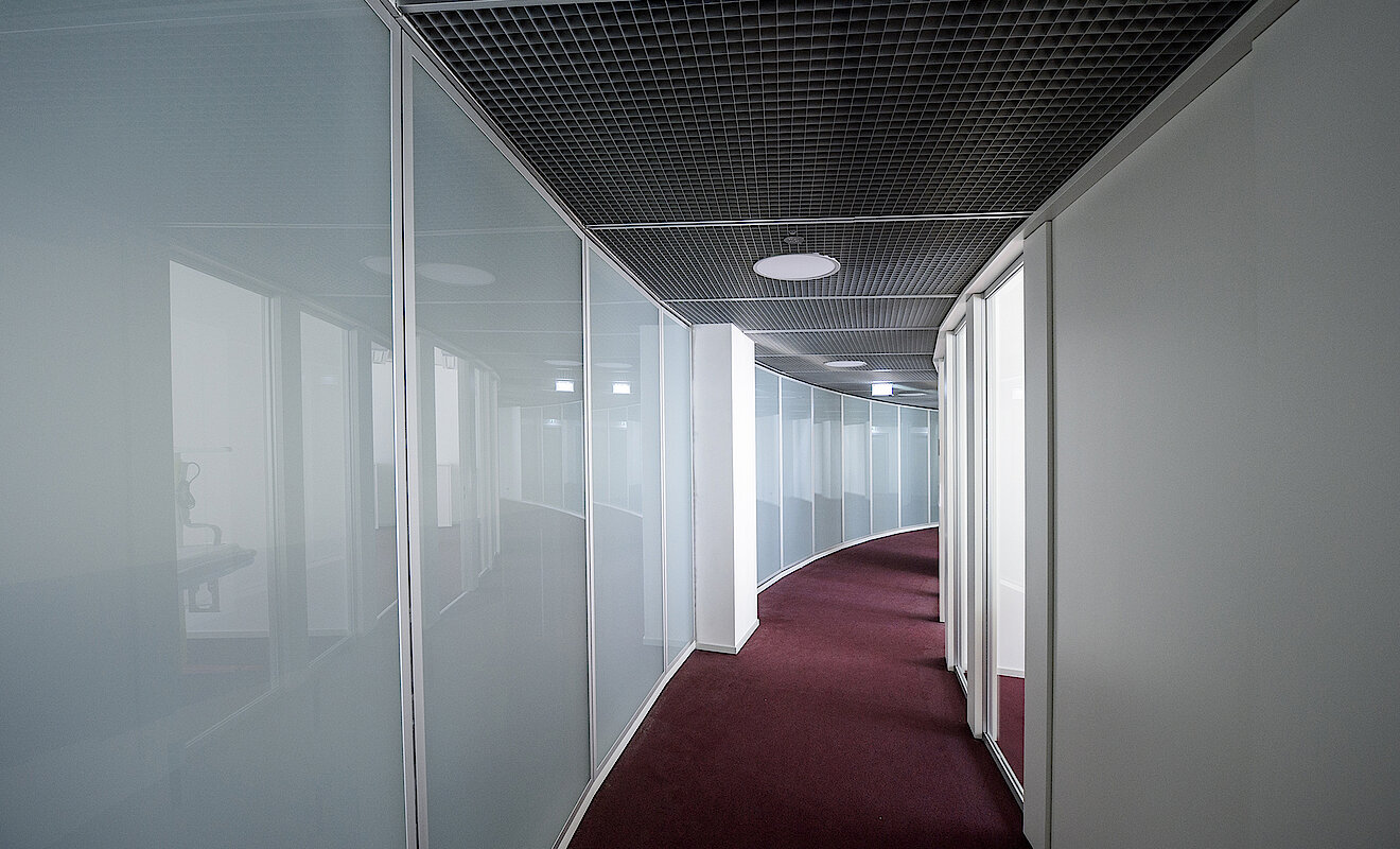 Gerundete Wandoberflächen mit ästhetischer Farbgebung verleihen den Büros in den sechs Etagen der Bremer Landesbank in Kombination mit Teppich und Alu-Rasterdecke englischen Charme. Die von TM Ausbau realisierten Holz-Glas-Trennwände lassen flexible Änderungen im Nutzungskonzept zu.