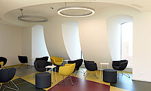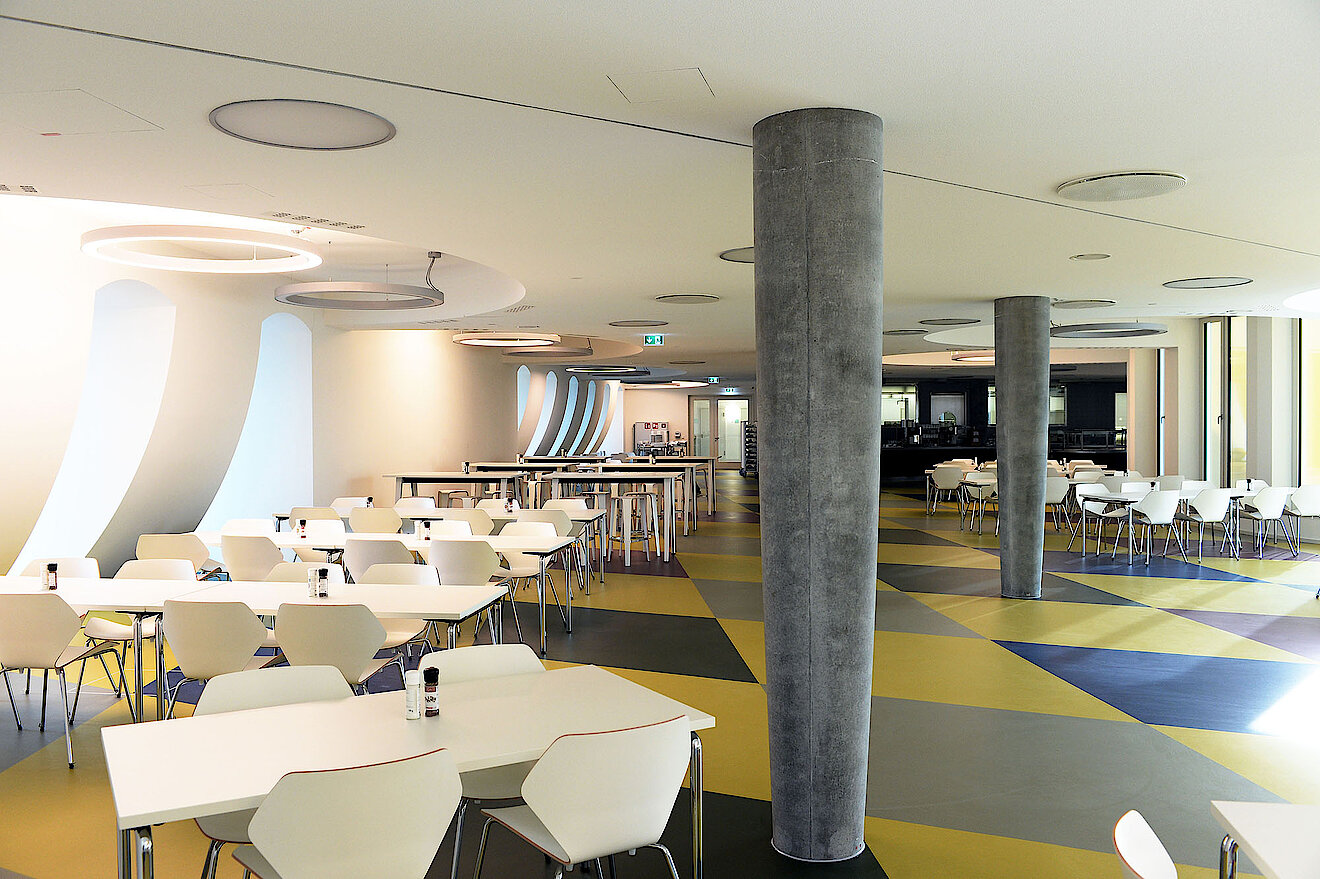 Herzstück des nach einem Entwurf des Büros Caruso St John Architects, London, errichteten Gebäudes ist das große Casino in der 6. Etage. TM Ausbau hat hier mit geputzten Akustikdecken, geschwungenen Gipskarton-Verkleidungen zwischen Gauben und Wänden sowie einem schachbrettartigen Boden in Gelb, Rot, Blau und Grau eine moderne, angenehme Atmosphäre geschaffen.