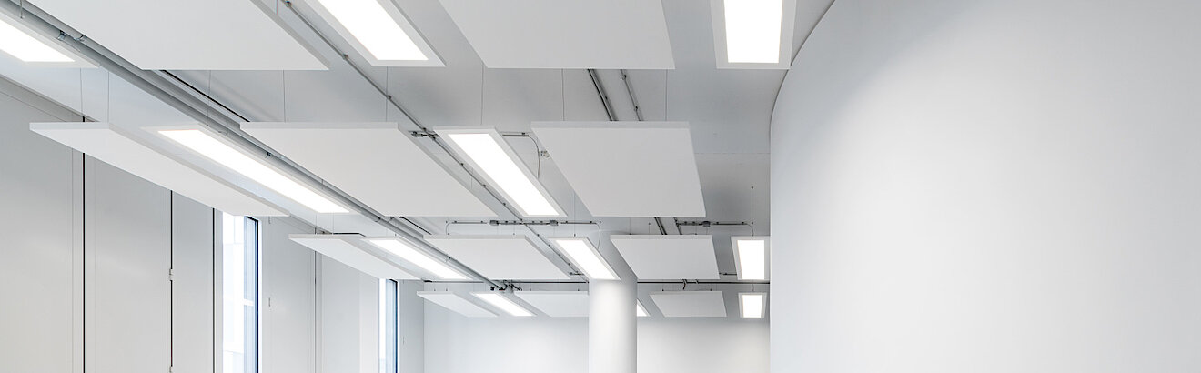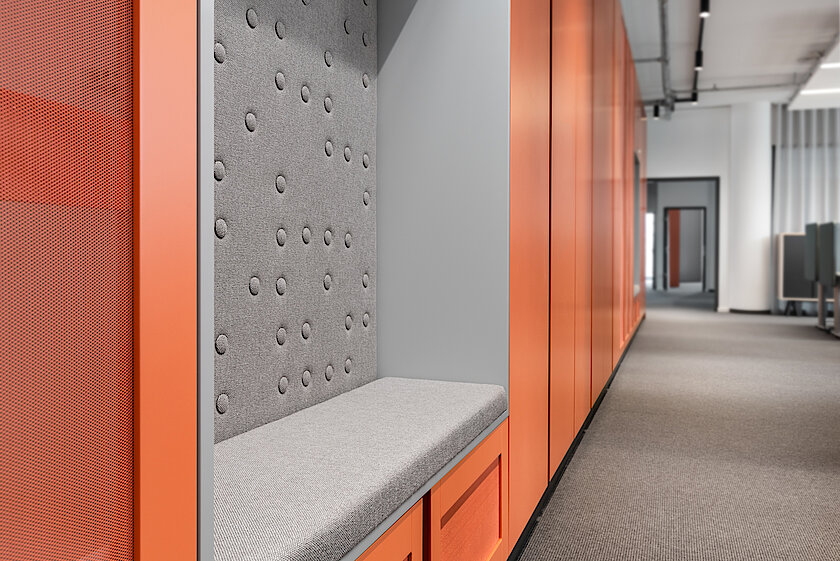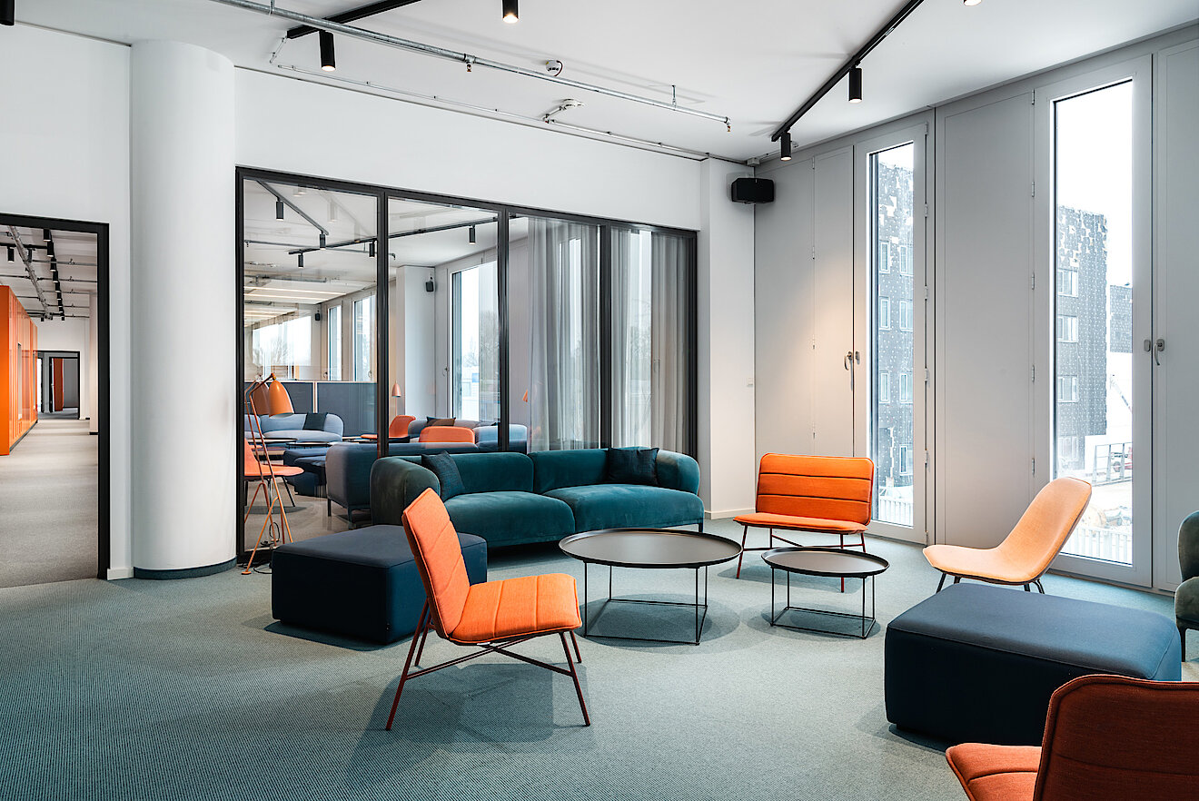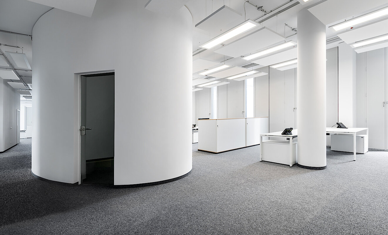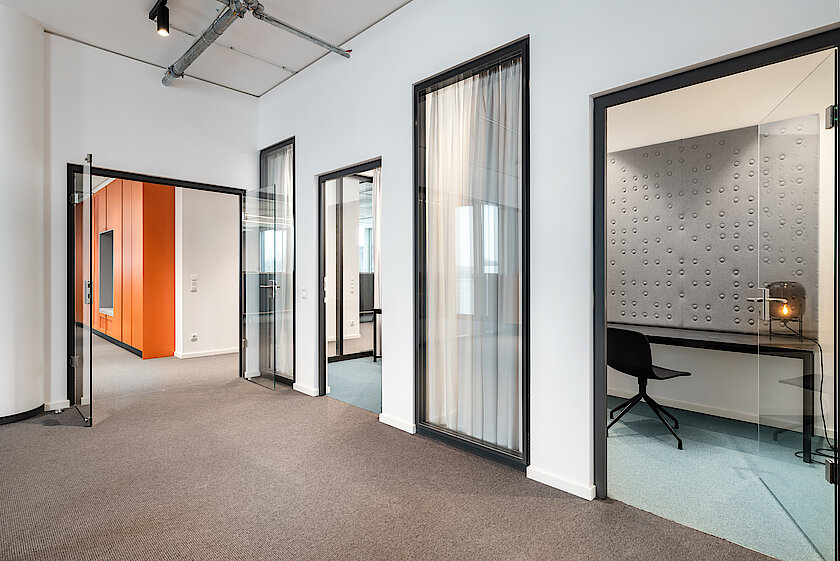 Die Glasfassade des Gebäudes wurde auch im Inneren aufgegriffen: So hat TM Ausbau eine Vielzahl an Systemtrennwänden und Vollglastüren eingebaut, die eine helle, lichtdurchflutete Atmosphäre in den Büros schaffen. Dem cleanen Look wirken farbige Elemente in den Lounge Areas, Küchen und Fluren entgegen, die sich als echte Eyecatcher erweisen. Die Verlegung des Doppelbodens und des Hohlraumbodens gehörte ebenso zum Leistungspaket von TM Ausbau wie der Einbau von Holzfaltwänden und elliptisch geformten Druckerinseln aus Gipskarton in verschiedenen Radien. Auch die Montage der Küchen übernahmen die Ausbau-Spezialist:innen. Für eine optimale Akustik wurden Gipskartonlochdecken und Deckensegel, teilweise mit Kühlung, angebracht. Zudem kamen auch Metallkühldecken im Rahmen des hochwertigen Mieterausbaus zum Einsatz und sorgen für gut temperierte Büros.