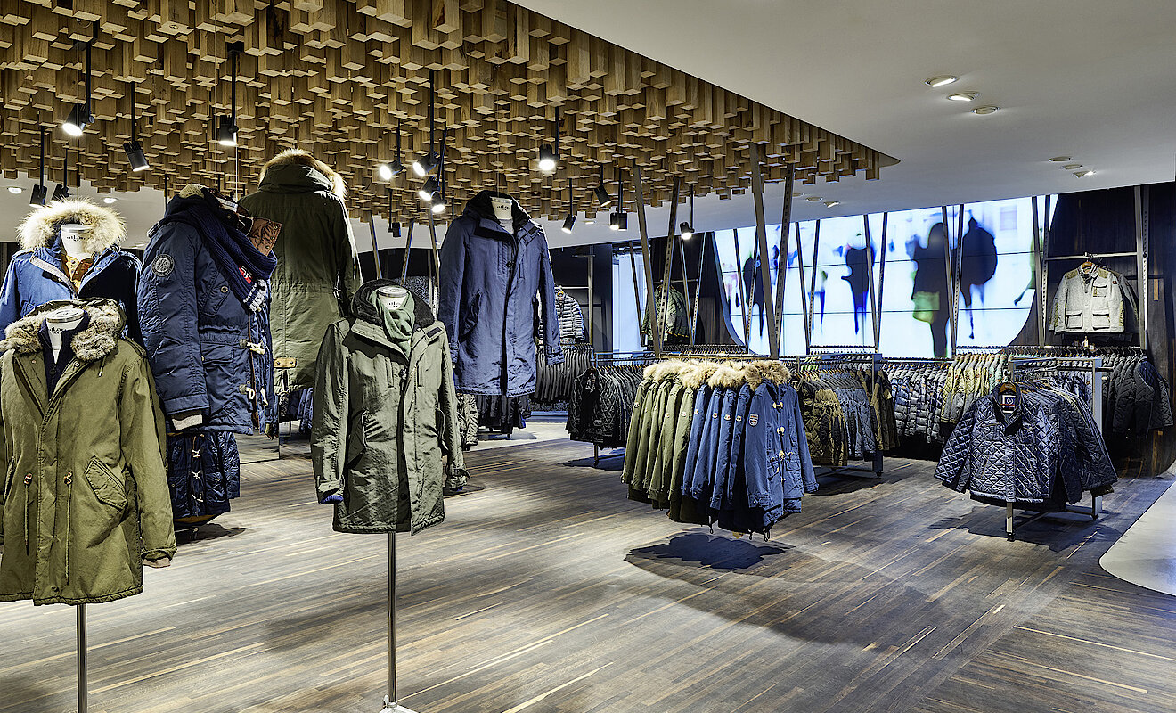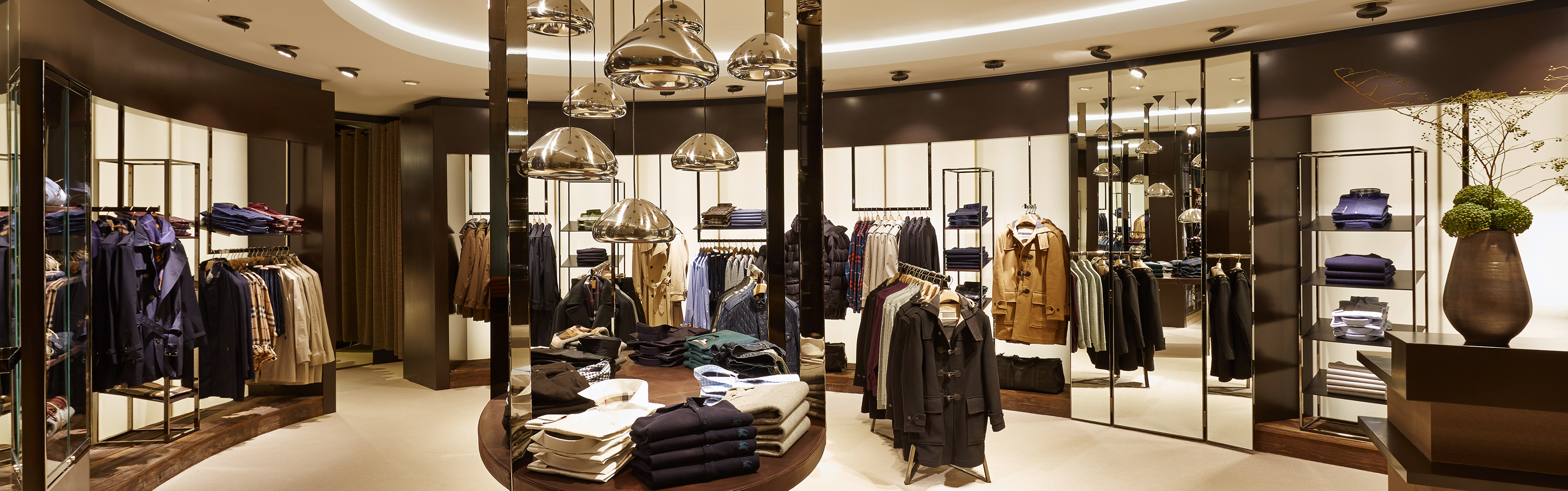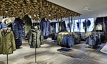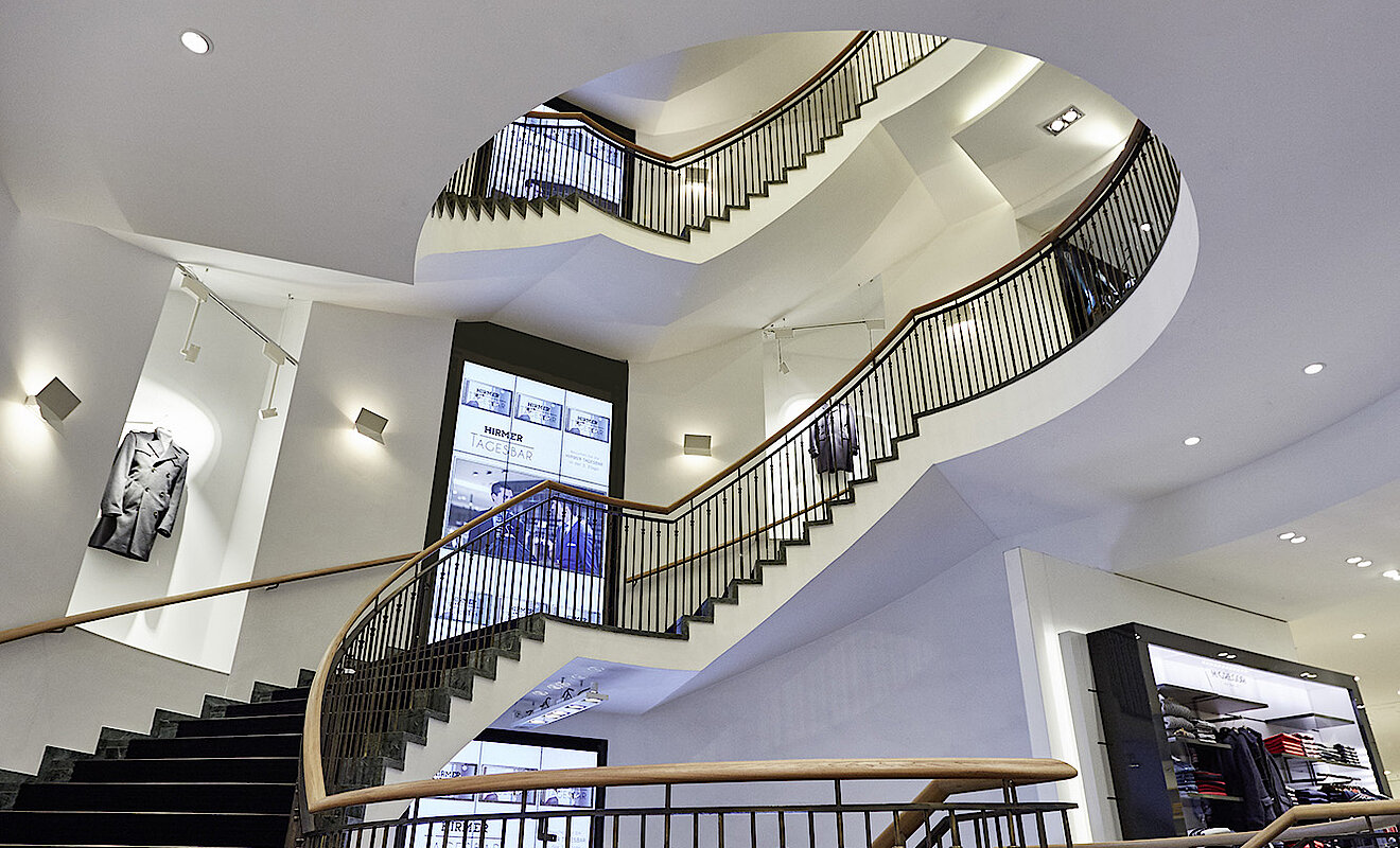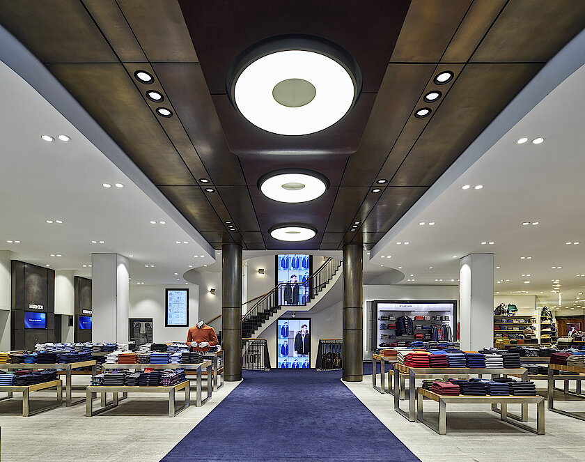 Der weltgrößte Herrenausstatter ist ein Münchner Traditionsunternehmen und führend in der Modewelt. Nicht nur bei der Kleidung ist HIRMER Trendsetter, sondern auch bei der Gestaltung der Verkaufsräume. Exklusiven Marken steht ein Premium-Innenausbau gut zu Gesicht. Zu den baulichen Besonderheiten gehören zum Beispiel eine abgehängte Decke in Ypsilon-Form mit Lichtvouten und individuell gebauten Formteilen, die hinsichtlich der Ladengestaltung eine Art Panoramalandschaft erzeugt. Viele Grundkonstruktionen für die Designerschränke und Stahlkonstruktionen für die Warenträger spielen ihre Rolle im Verborgenen, aber ohne das äußerst exakte Einmessen und Setzen der Unterkonstruktionsteile würden die mit dunkel abgesetzten Rahmen, wie aufgehängte Bilder wirkende, Regalsysteme nicht funktionieren.