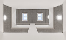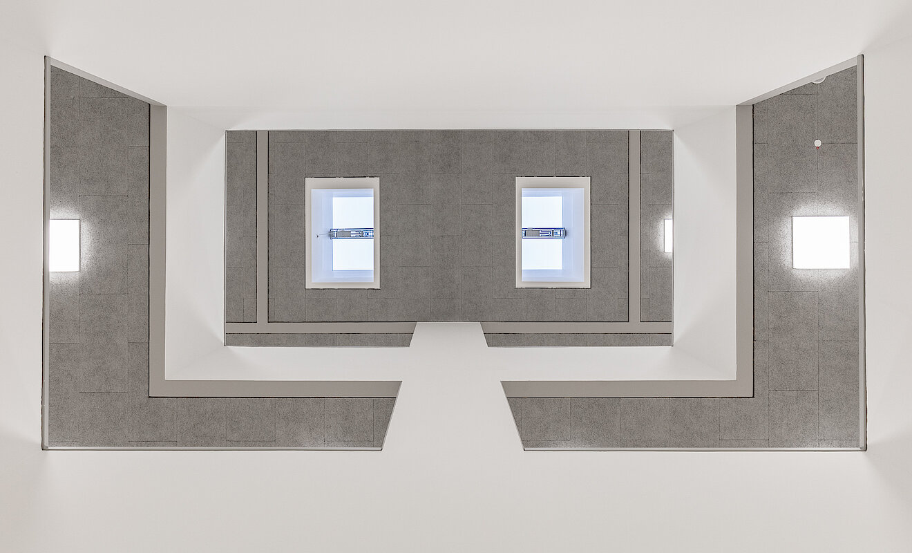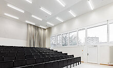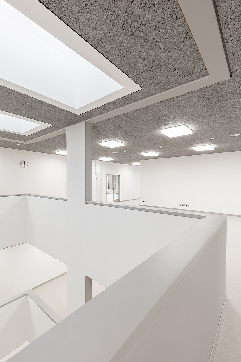 Die Unterrichtsräume der Lessing-Stadtteilschule in Hamburg sind wie Flügel eines Windrads um ein zentrales Atrium angeordnet, das als Erschließungs-, Unterrichts- und Kommunikationsfläche dient. In der Pausenhalle, in der Mensa sowie in den Räumen für Musik, Kunst und Theater dominieren puristische Farben wie Grau und Weiß in Kombination mit moderner Betonoptik. Vereinzelt wird das für einen Schulcampus außergewöhnliche Erscheinungsbild von warmen Holzelementen und schwarzen Details raffiniert unterbrochen.