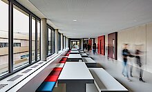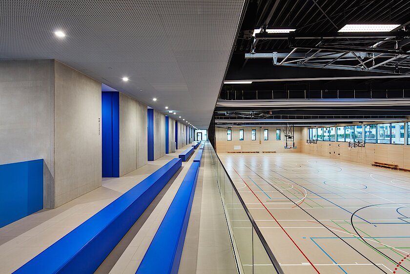 Auf dem Schulcampus Tolkewitz in Dresden dominiert geradliniges Design, das mit leuchtenden Elementen in Rot und Blau zu einem stimmigen Gesamtbild verschmilzt. TM Ausbau hat beim Neubau der vierzügigen Oberschule und des fünfzügigen Gymnasiums mitsamt Sporthallen klassische Innenausbau-Arbeiten geleistet. Dazu zählen zum Beispiel 5.500 m² Gipskarton-Trennwände, 2.300 m² Gipskarton-Decken, mehrere Hundert Metalldeckensegel sowie 3.750 m² Deckendämmung. Zusätzlich hat unser Team die Tribüne in der Turnhalle, Flure, Lernbereiche, Mensa sowie den Boulevard mit Metallrasterdecken auf einer Gesamtfläche von 7.500 m² ausgestattet. Das umfangreiche Schulbauprojekt hat TM Ausbau in einem sehr kurzen Zeitraum ausgeführt und den Schulbeginn im Frühjahr 2018 maßgeblich mitermöglicht.