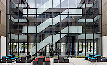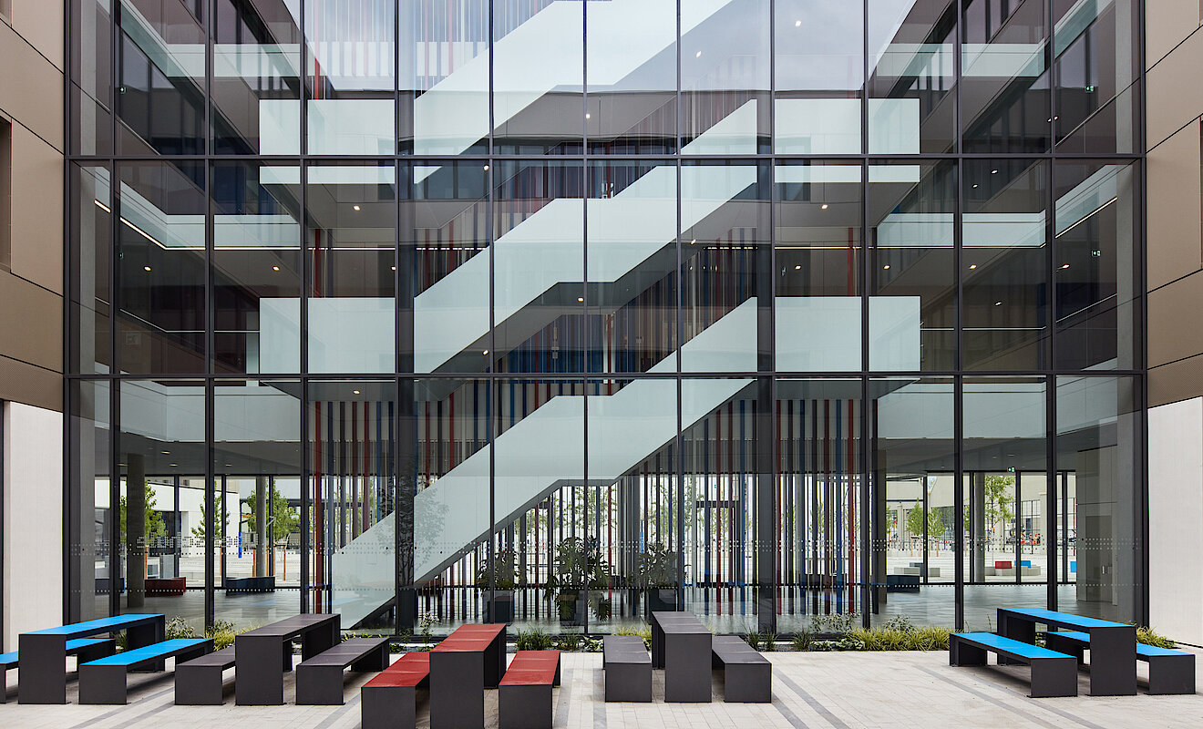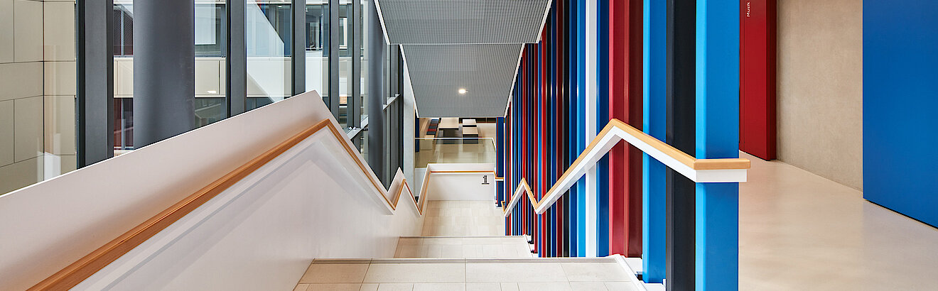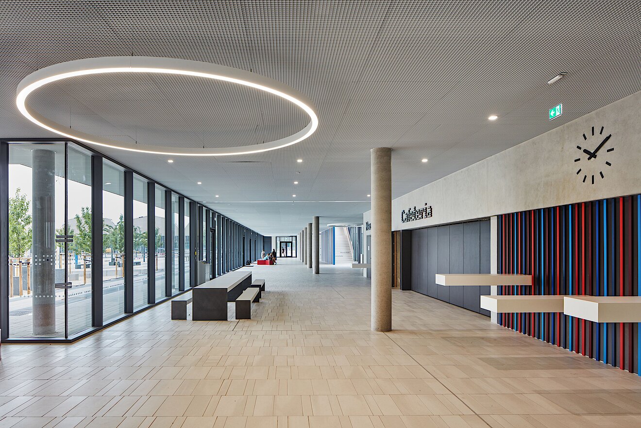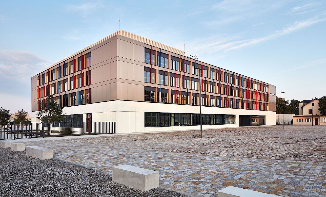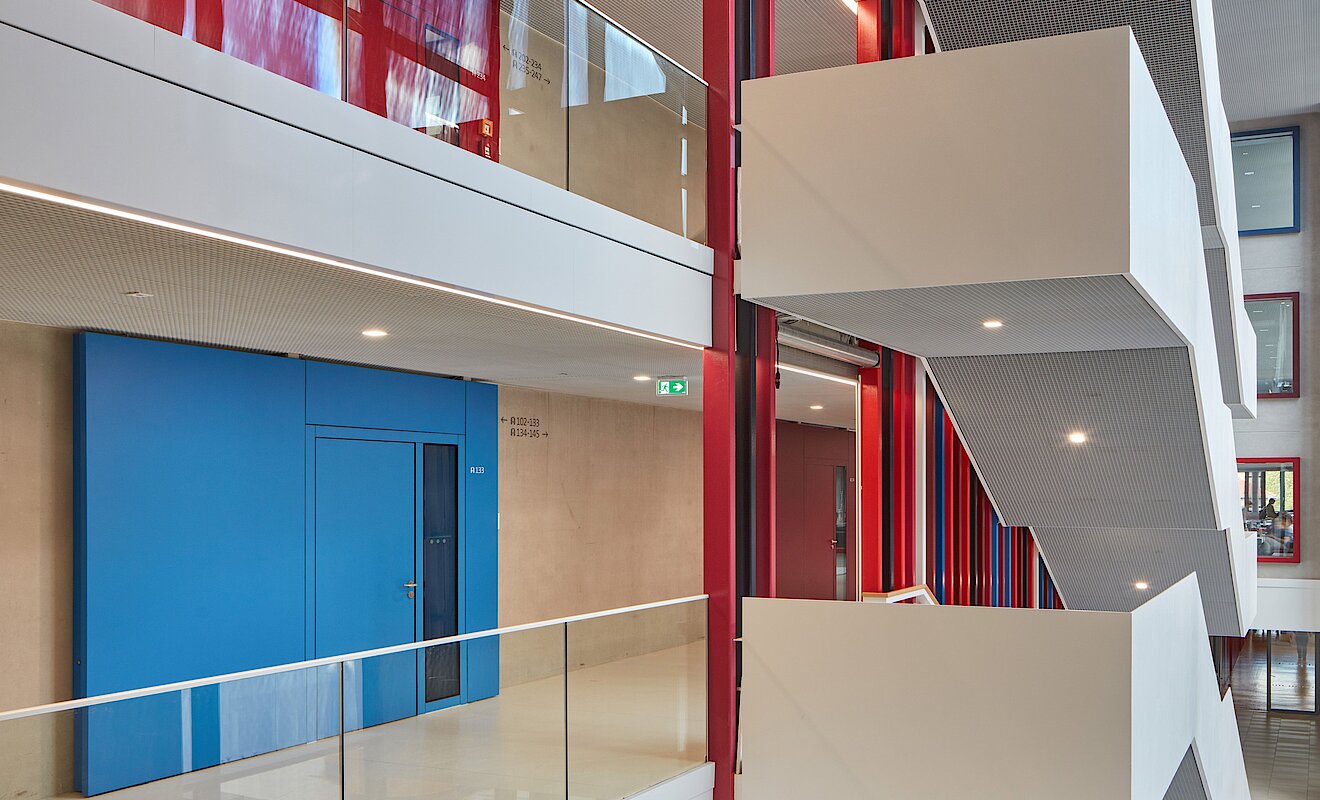 Der Schulcampus Tolkewitz ist als L-förmiger eingeschossiger Grundbaukörper angelegt, der zwei rechteckige, dreigeschossige Aufbauten trägt. Dessen helles und minimalistisches Gestaltungskonzept spiegelt sich sowohl im Innen- als auch im Außenbereich wider. Im Gebäude haben wir unter anderem die Unterseiten der Stahltreppen mit Metallrasterdecken versehen und in den Klassenzimmern akustisch wirksame Metallkassettendeckensegel mit hohem Schallabsorptionsgrad angebracht. Von der optimalen Lernatmosphäre profitieren rund 1.800 Schüler:innen.