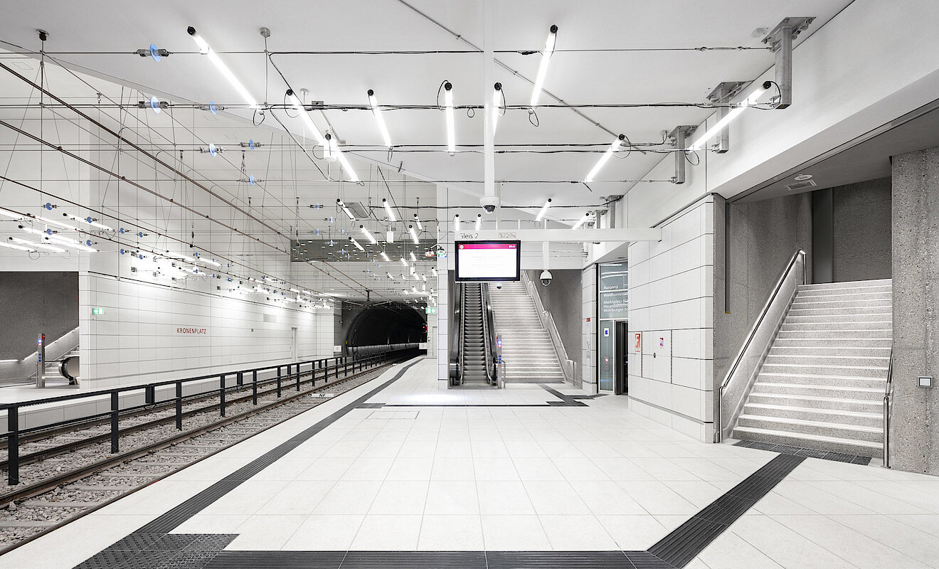 Baubeats in der Tiefe: Von Oktober 2018 bis Februar 2021 wurde im Stadtbahntunnel Karlsruhe gebaggert, abgerissen, aufgebaut und eingerichtet, was das Zeug hält. Die sieben neuen Bahnhöfe begeistern nun die Fahrgäste mit ihrem cleanen und modernen Look. Bei diesem technisch sehr anspruchsvollen Ausbauprojekt hat TM Ausbau die fünf U-Bahn-Haltestellen Kronenplatz, Marktplatz (Kaiserstraße), Marktplatz (Pyramide), Europaplatz und Ettlinger Tor ausschließlich mit Sonderkonstruktionen und Sondermaterialien realisiert. Mit viel Know-how schafften die Spezialist:innen eine terminliche Punktlandung – seitdem fahren die Stadt- und Straßenbahnen täglich durch die City.