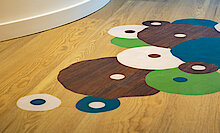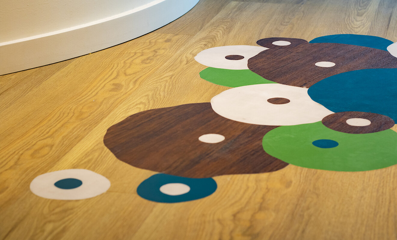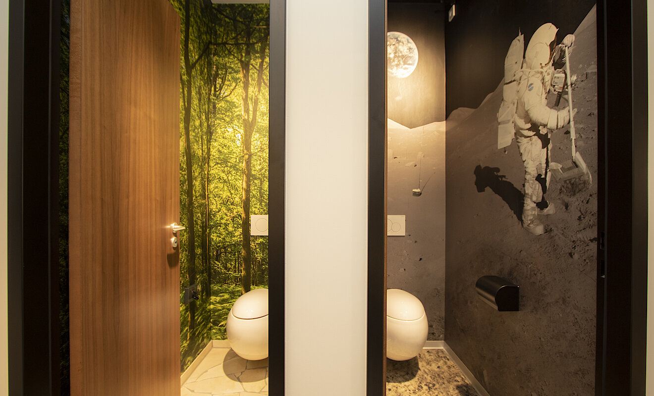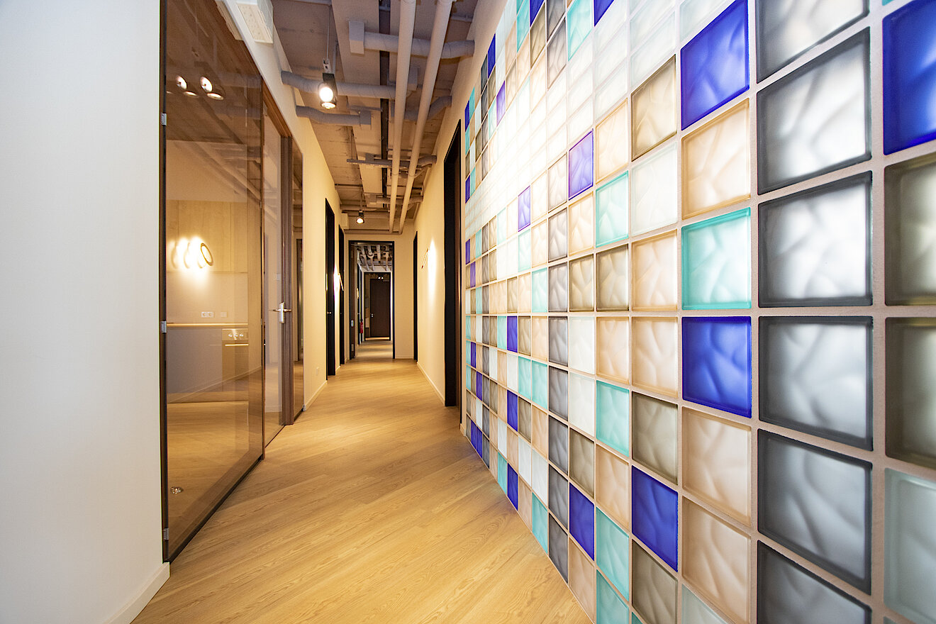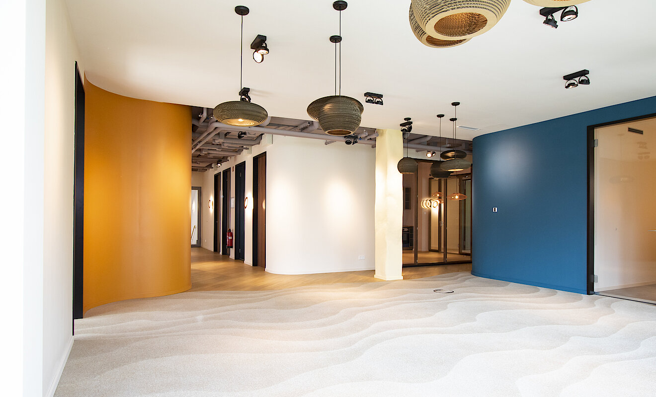 Auf der gesamten Mietfläche hat TM Ausbau maßgeschneiderte Schreinerleistungen realisiert wie zum Beispiel beide Küchen, Sitzbänke in der „Arena“ und die Spinde für persönliche Gegenstände. Die Mieterausbau-Spezialist:innen übernahmen auch die professionelle Montage des innen- und außenliegenden Sonnenschutzes, der Glas-Systemtrennwände, mobilen Trennwände und Holzblocktürelemente. Hinzu kamen Malerarbeiten in 20 verschiedenen Farben sowie Tapezierarbeiten mit hochwertigen Motivtapeten. Neben Teppichböden im Dünen-Look und eigens bedruckten Vinylböden in den Büro- und Aufenthaltsräumen hat das Team in den Toiletten Bodenfliesen aus Altmühltaler Bruch-Naturstein verlegt. Ein weiteres Highlight ist die nach Kundenwunsch gestaltete Glasbausteinwand – ein Garant für staunende Blicke.