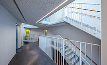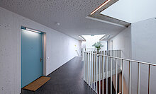 Beim Innenausbau der 138 Wohneinheiten verwendeten die Spezialist:innen von TM Ausbau hochwertige Trockenbaukonstruktionen für Wände, Decken und Türen, so dass die hohen Ansprüche an Schall- und Brandschutz mehr als nur erfüllt werden konnten. Eine besonders wichtige Rolle spielte der Schallschutz bei den acht gemeinschaftlich genutzten Clusterwohnungen, Gemeinschaftsräumen, Ateliers und Werkstätten. TM Ausbau setzte hier auf eine akustisch wirksame abgehängte Decke mit geringer Aufbauhöhe und – in den Gemeinschaftsräumen – auf Vorsatzschalen mit Schallschutzplatten. In den Treppenhäusern sorgen Lochdecken mit seitlichen Aufkantungen vom 1. Untergeschoss bis zum 4. Obergeschoss für den passenden Schallschutz. Alle Wände, Stützen, Verkleidungen und Trennwände kommen ebenfalls von TM Ausbau.